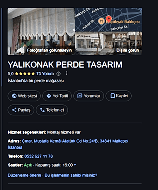 Yalıkonak Perde Tasarım, 2019 yılında İstanbul Küçükyalı’da hizmete başlamış bir perde tasarım mağazasıdır. 6 yıllık hizmetini 5 yıldız ile devam ettirmektedir. Sektördeki 40 yılı aşkın tecrübesini Yalıkonak Perde ismiyle binlerce konut ve iş yerinde sergilemiştir. Siz de bizi mağazamızda ziyaret edebilir veya telefonla ulaşıp her türlü perde ihtiyaçlarınıza cevap bulabilirsiniz.